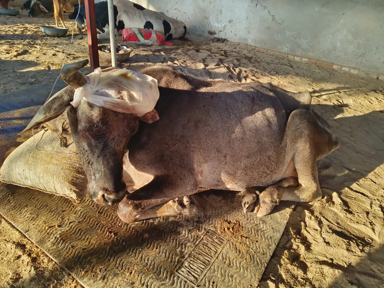 This picture shows our team performing a critical surgery to remove dead tissue and maggots from a cow’s head injury. These procedures are painful, slow, and require expensive antiseptics, medicines, IV drips, painkillers, and professional handling.